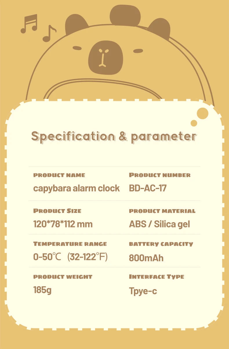 Bedside LED Clock Kids Alarm Clock Children's Sleep Trainier Temperature Display With Rechargeable Control Digital Cute Capybara