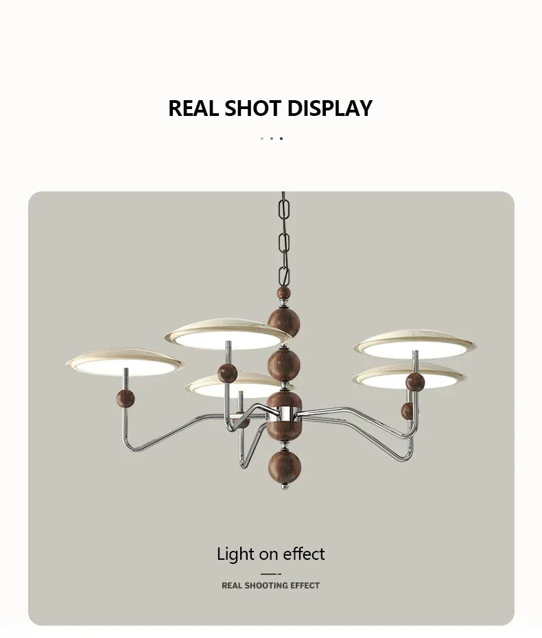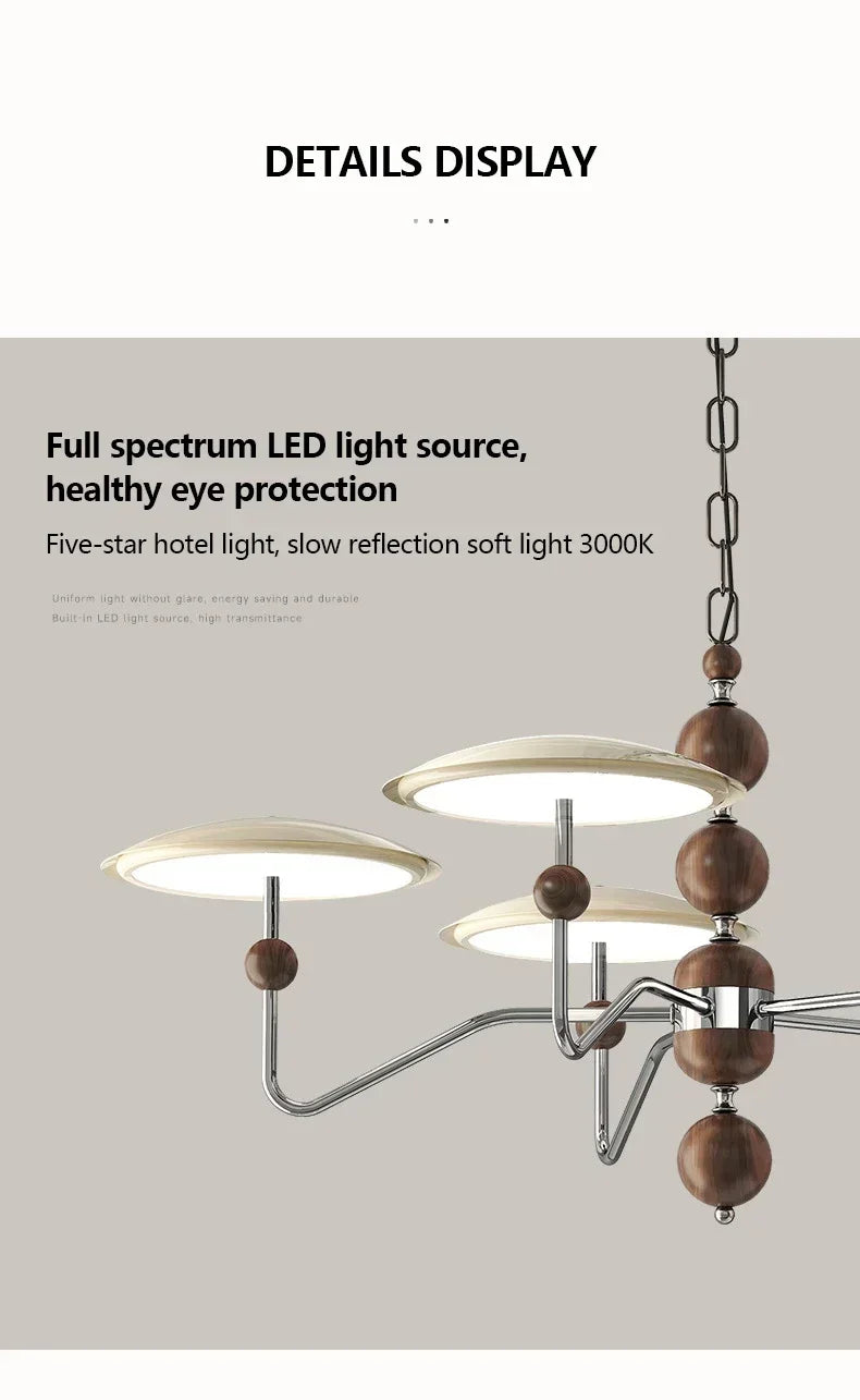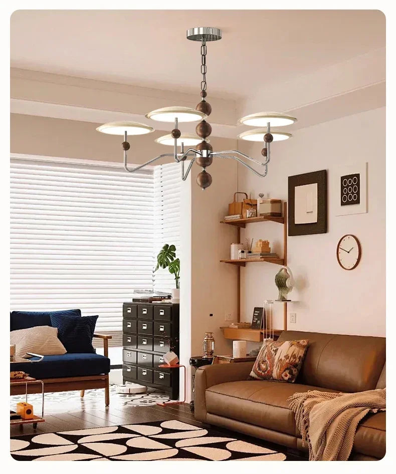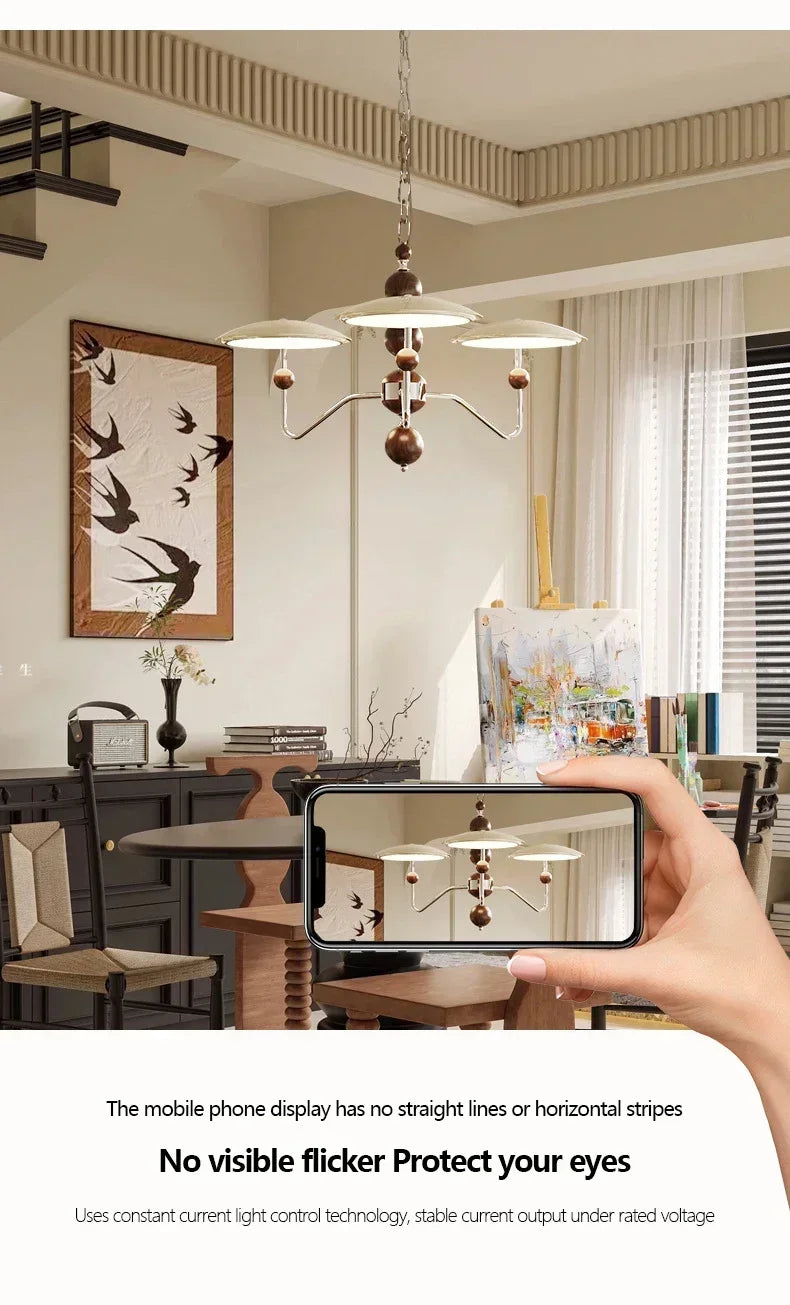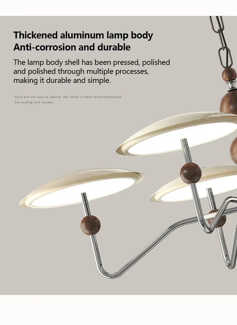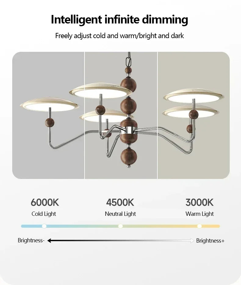 A sleek, electroplated iron “saucer” ringed in warm walnut hovers overhead, pouring 249–2 000 lumens of flicker-free, full-spectrum LED light across your living room, dining table, or hotel suite.