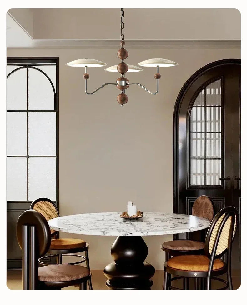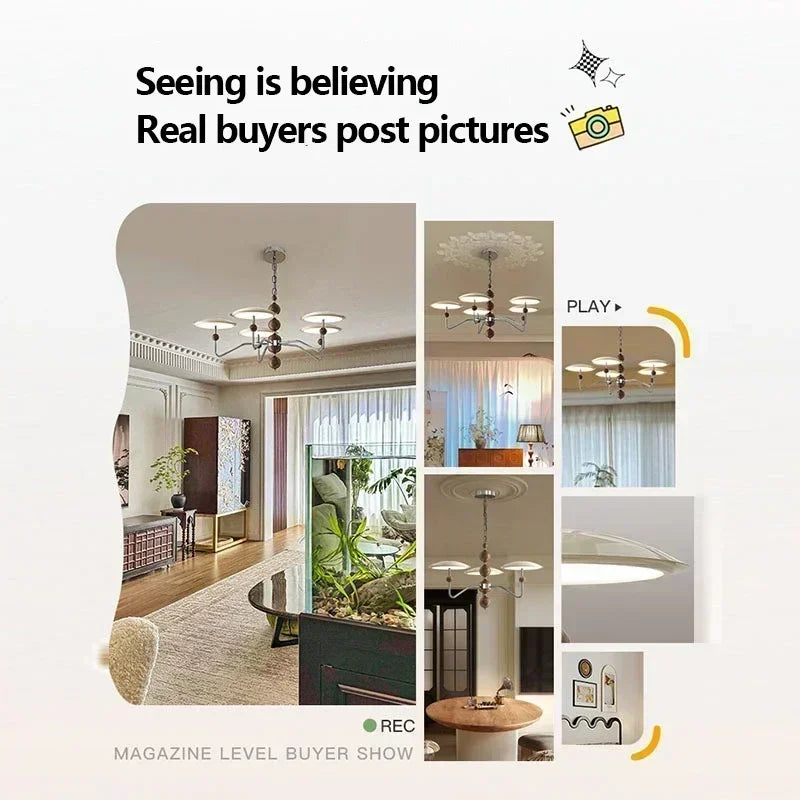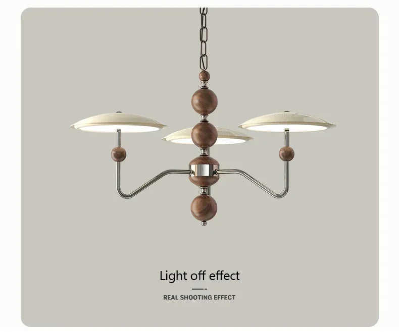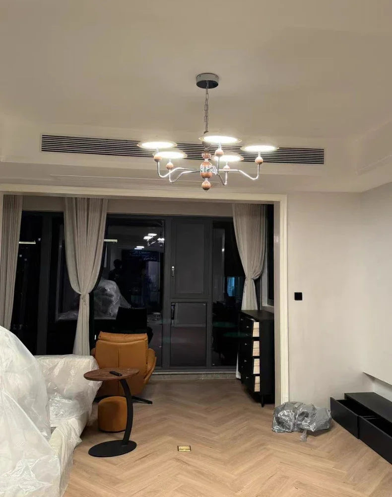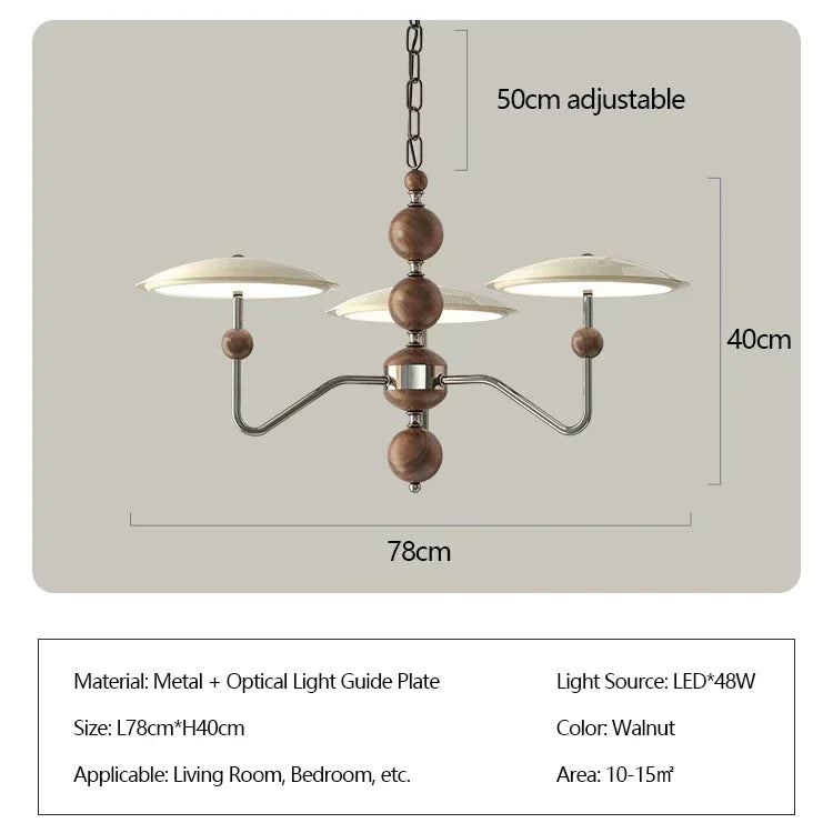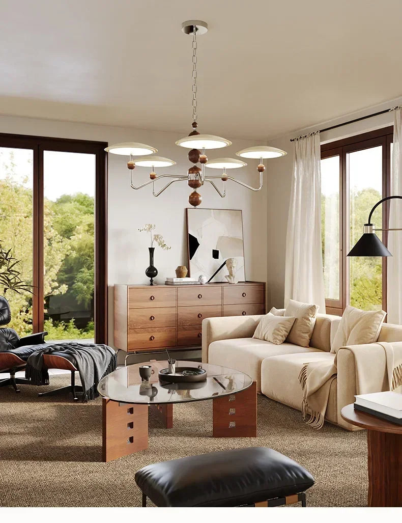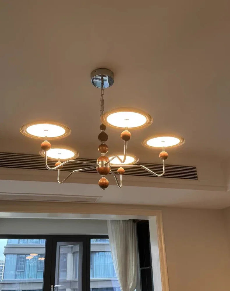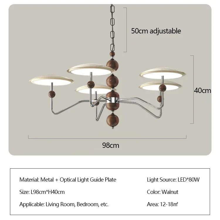 A sleek, electroplated iron “saucer” ringed in warm walnut hovers overhead, pouring 249–2 000 lumens of flicker-free, full-spectrum LED light across your living room, dining table, or hotel suite.