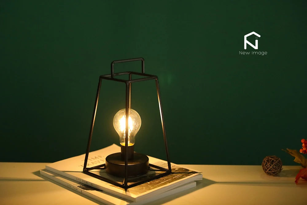 Retro Geometric Candle Holder, Black Iron Cage Table Lamp, Cordless, Battery Powered, Metal Crafts