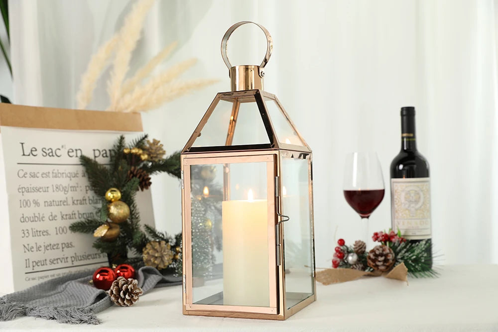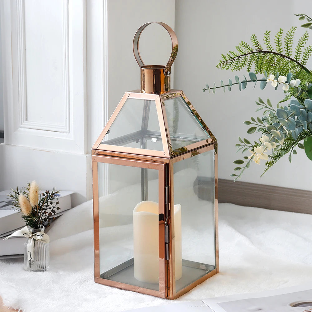 Rose Gold Stainless Steel Candle Holder Decorative Lanterns with Tempered Glass Table Candle Stick Wedding Party Home Decor