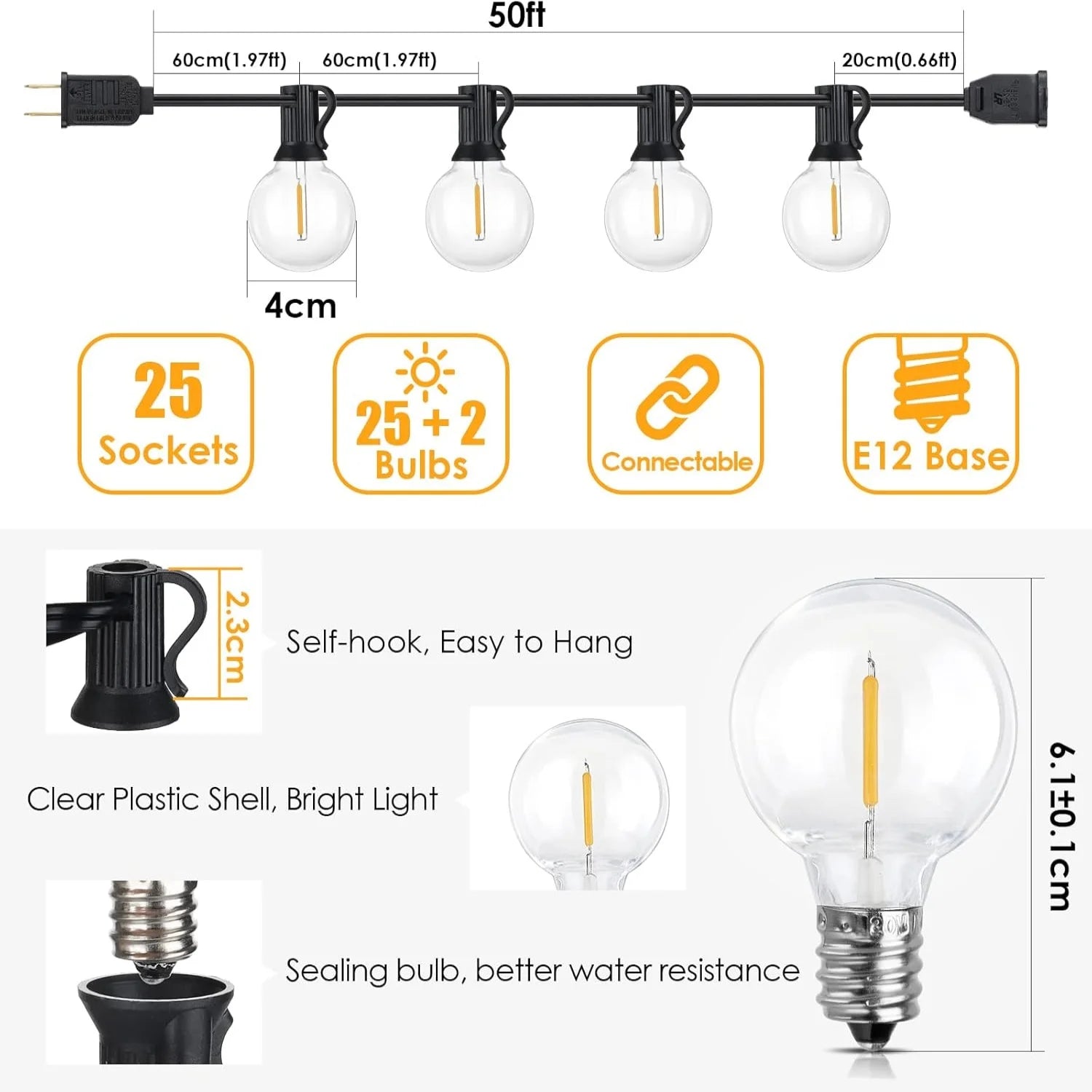 ST38/G40 Dimmable LED Outdoor String Lights – Connectable Warm 2700K Lighting for Porch & Backyard Ambience